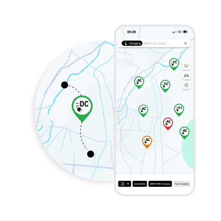 The map lets you find charge points – in the app. Filter by plug types, charging speed, mode of authentification and availability. View ratings and leave reviews.